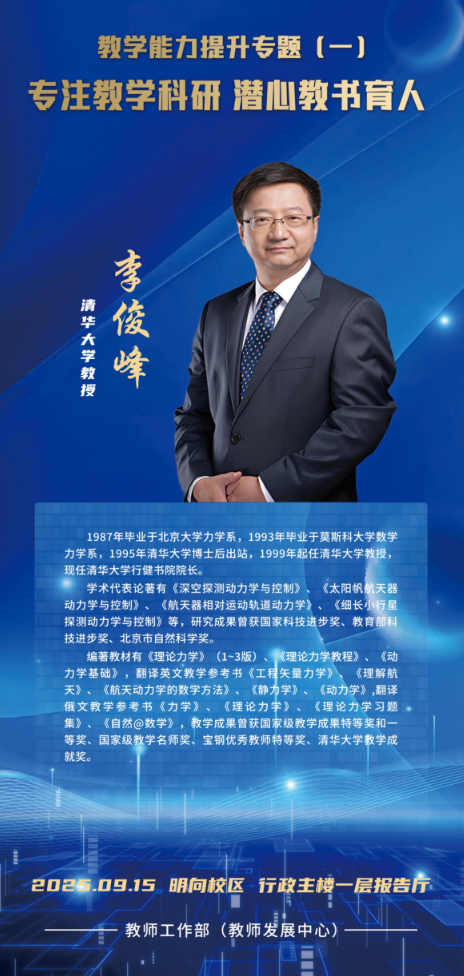 本次专题讲座以“专注教学科研 潜心教书育人”为主题,特别邀请国家级教学名师、清华大学李俊峰教授,与我校教师面对面深入交流,分享先进的教育理念、如何精心打造一堂优质课程、如何成为一名优秀教师。