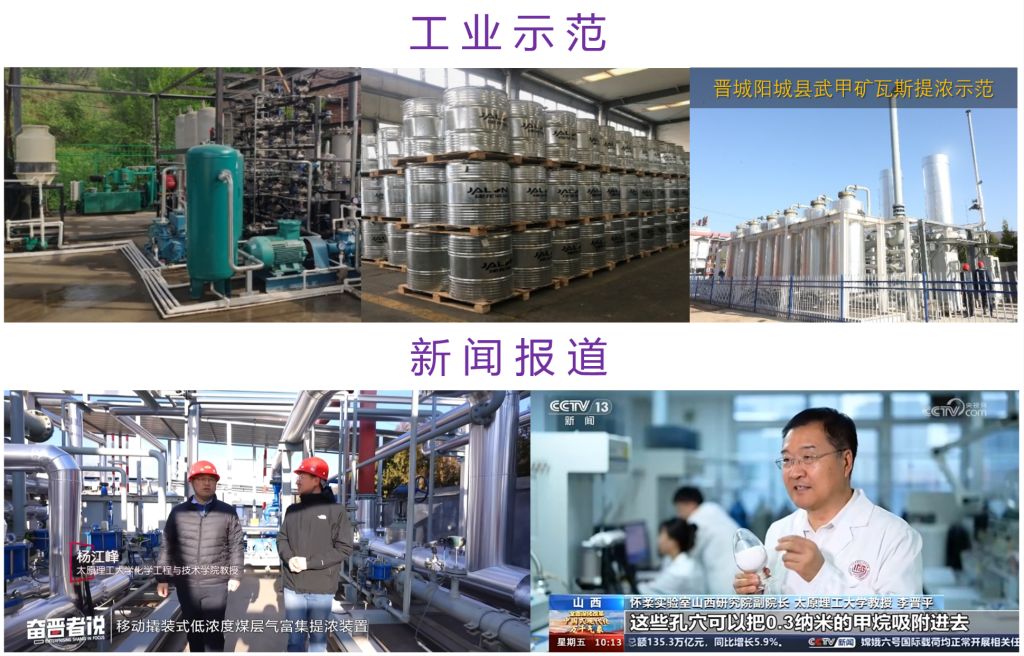 CH4、CO2等温室气体减排是实现“双碳”目标终极途径。对于低浓度CH4富集,选择性与高回收效率是难题;对于燃煤电厂烟气CO2捕集,稳定抗湿是关键。该团队十多年来围绕低浓度CH4的富集开展研究,在CH4/N2混合物中高效识别CH4及深度脱N2方面取得重要进展(Nat. Commun., 2025, 16, 8065; Angew. Chem. Int. Ed., 2025, 64, e202510242; Angew. Chem. Int. Ed., 2022, 61, e202116850)。相关的CH4富集技术已实现成果转化,并在山西省华阳新材料集团和阳泰集团实现工业化应用,部分研究成果被CCTV-2和CCTV-13进行了报道,被认为是实现全域煤层气高效利用的全新解决方案。在CO2捕集方面,克服吸附剂在潮湿条件下CO2的捕集效率降低的问题,将水分的存在转化为有利于CO2捕集的条件,实现了高湿度下长期稳定的捕集效果(Adv. Mater., 2025, 37, 202410500)。以燃煤电厂烟气中CO2的低成本捕集为研究目标,创制了N2优先渗透膜,选择性取得突破。优化了CO2渗透的膜性能,创建了一级增压三段分离的低成本CO2分离捕集工艺。与传统CO2膜三级增压分离相比,成本可降低2/3(<150元/吨),为烟气CO2捕集向低成本、低能耗转型提供了新思路。该团队的CO2膜法工艺年捕集1万吨电厂烟气CO2项目已在山西介休安泰集团启动实施。